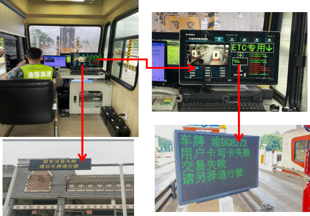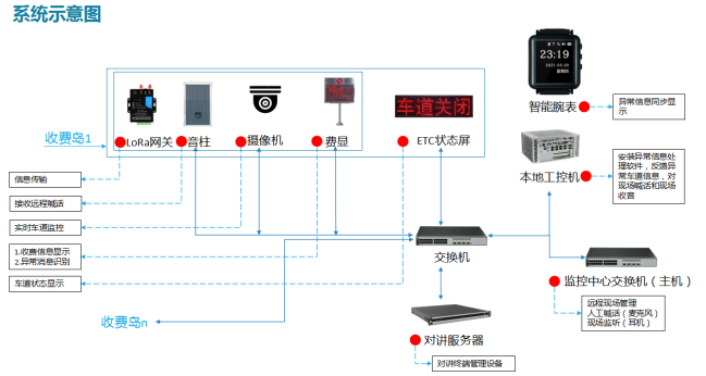 該系統(tǒng)由費(fèi)額顯示系統(tǒng)、語(yǔ)音提示系統(tǒng)、無(wú)線通信系統(tǒng)、車道狀態(tài)屏、車道引流屏共同組成。當(dāng)收費(fèi)車道出現(xiàn)異常,管理人員通過“智能腕表”同步接受異常提示,費(fèi)額顯示器、車道狀態(tài)屏顯示異常信息,同步到收費(fèi)站前的車道引流屏提醒車輛收費(fèi)車道通行情況,防止車輛持續(xù)涌入導(dǎo)致?lián)矶隆?/p>