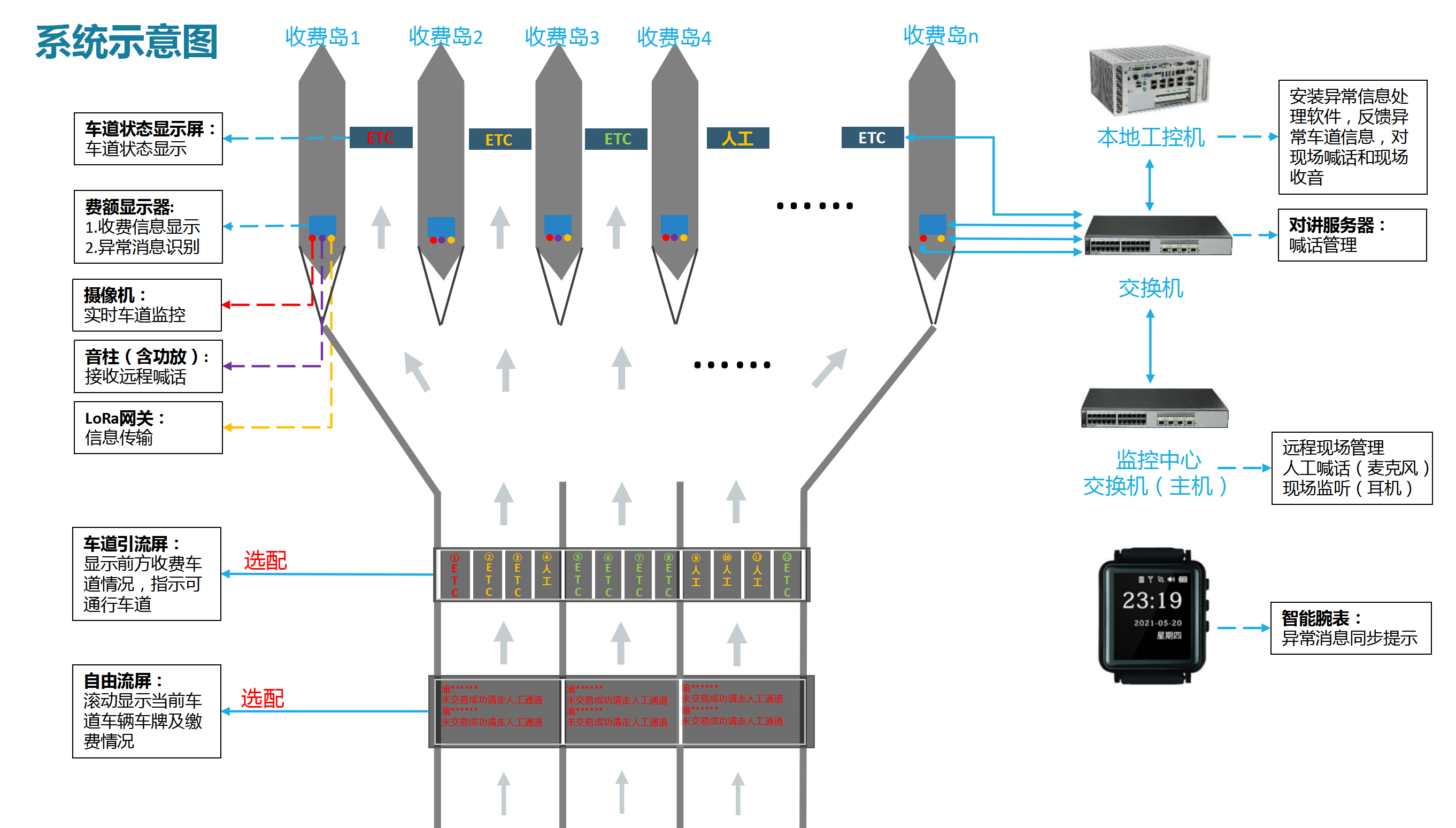 該系統(tǒng)由費(fèi)額顯示系統(tǒng)、語音提示系統(tǒng)、無線通信系統(tǒng)、車道狀態(tài)屏、車道引流屏共同組成。系統(tǒng)還配置了專門的軟件管理平臺,可對每一條收費(fèi)車道進(jìn)行實(shí)時監(jiān)控,管理人員無需到場即可通過“遠(yuǎn)程喊話”的形式處理特情。系統(tǒng)還可集成自由流屏和車道引流屏,一同助力打造暢行的高速公路收費(fèi)站。